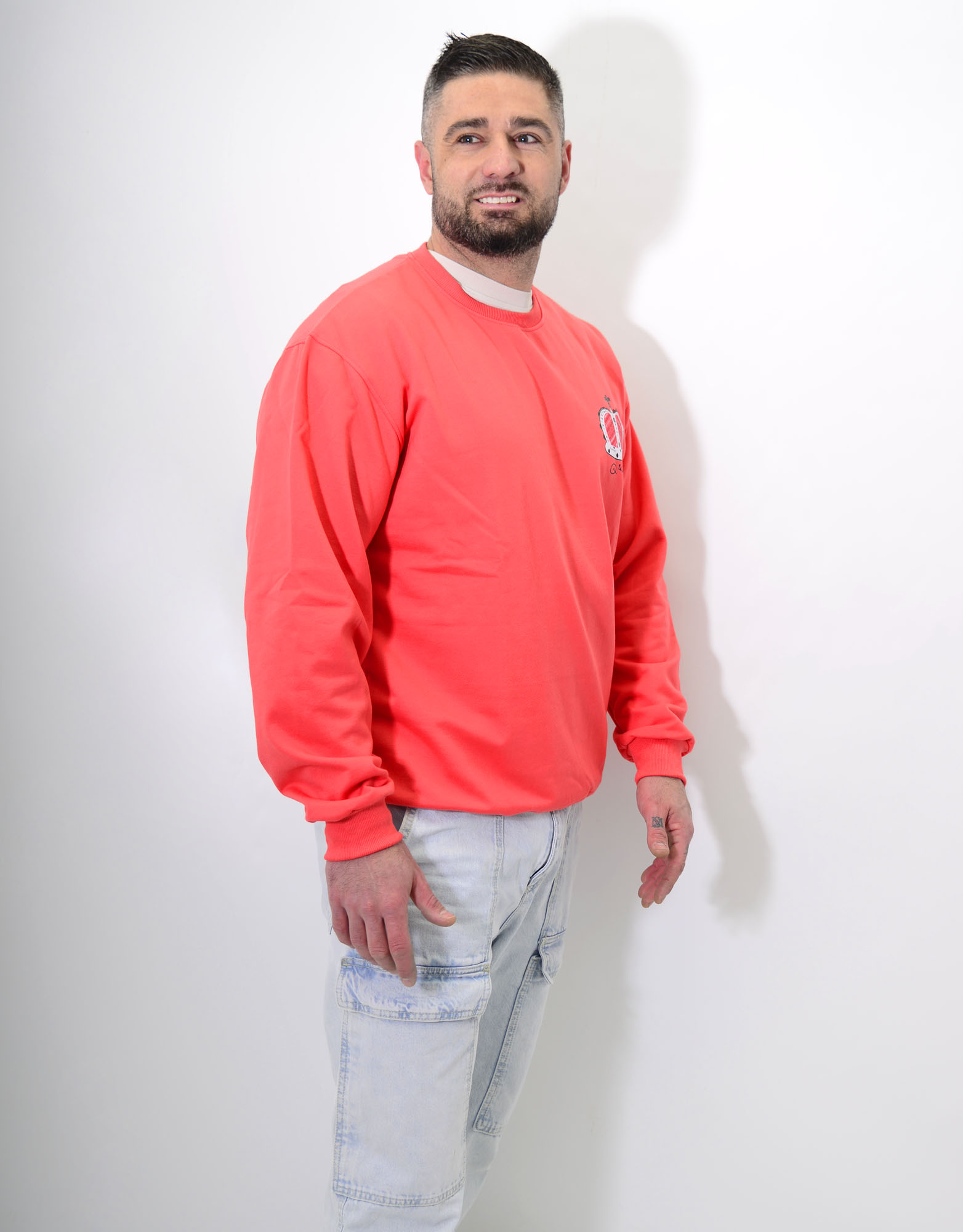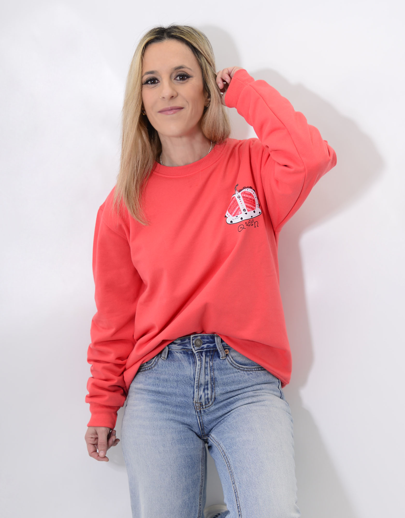 Sudadera unisex de manga larga y pelito por dentro. Con fondo rojo cereza muy bonito y favorecedor.