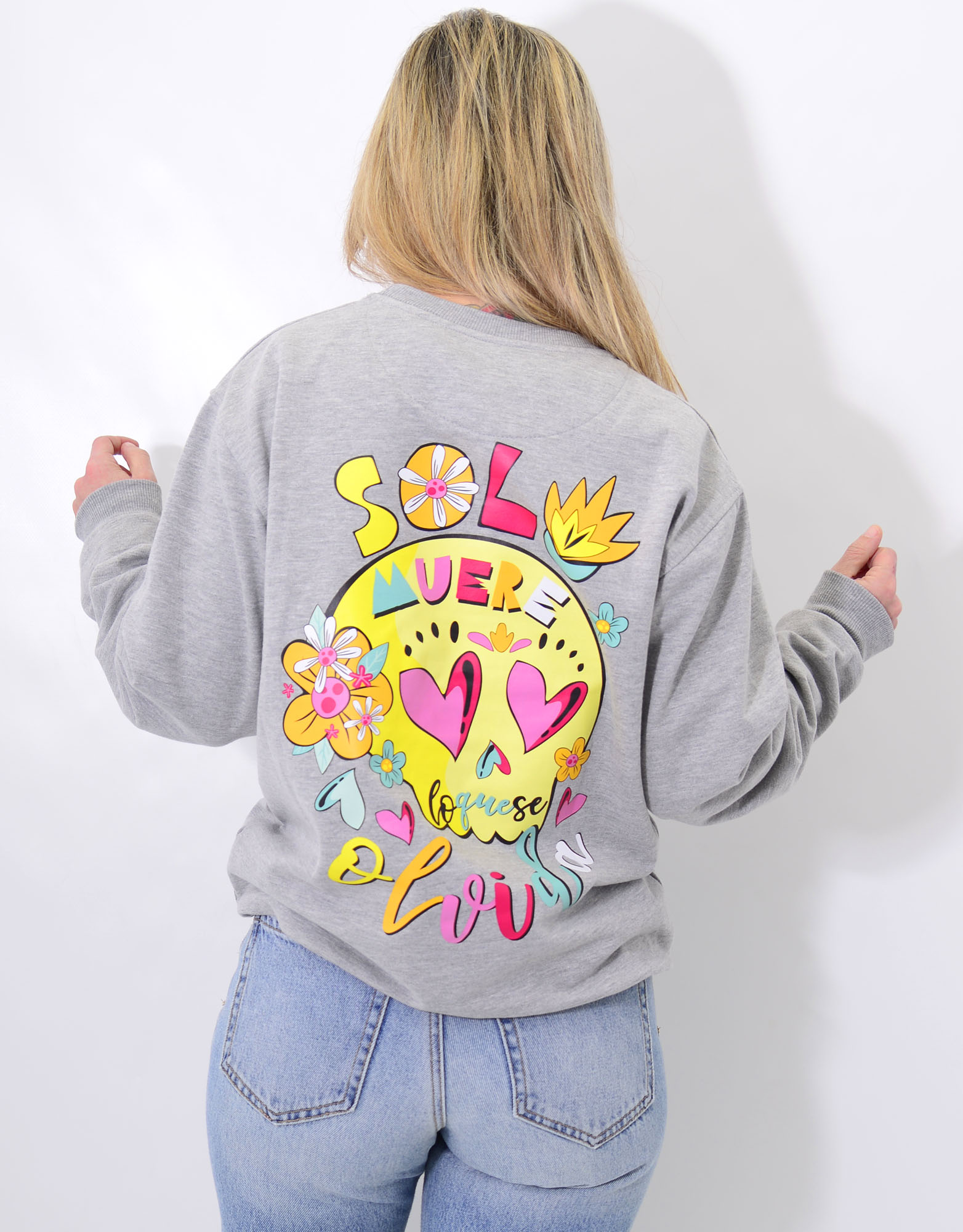 Sudadera unisex de manga larga y pelito por dentro. Con fondo gris, muy bonito y combinable.