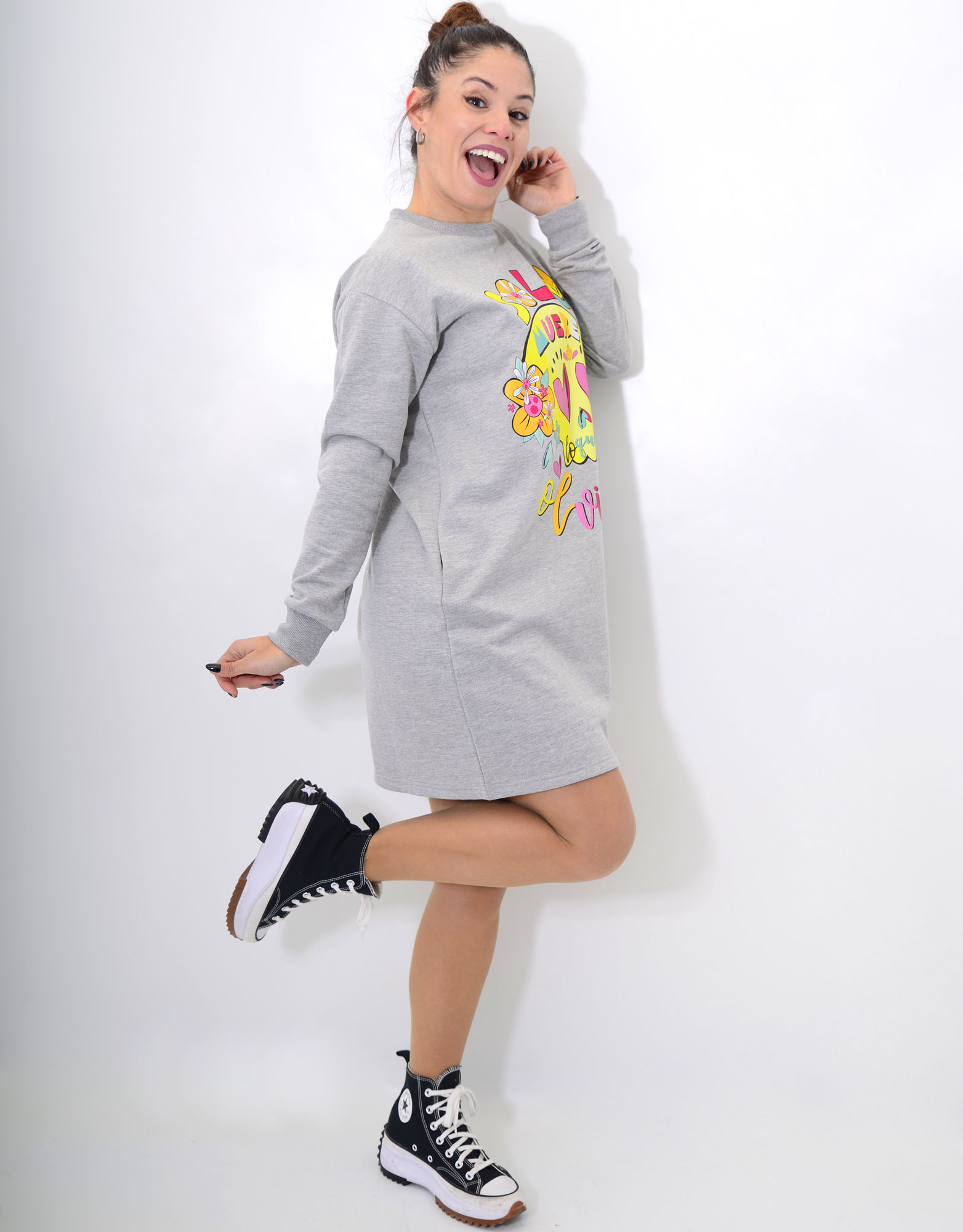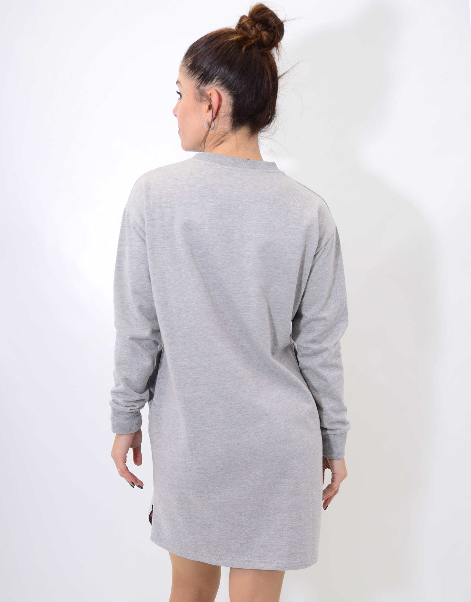 Vestido sudadera corto evasé, con manga larga y cuello redondo. Bolsillos laterales y pelito por dentro.